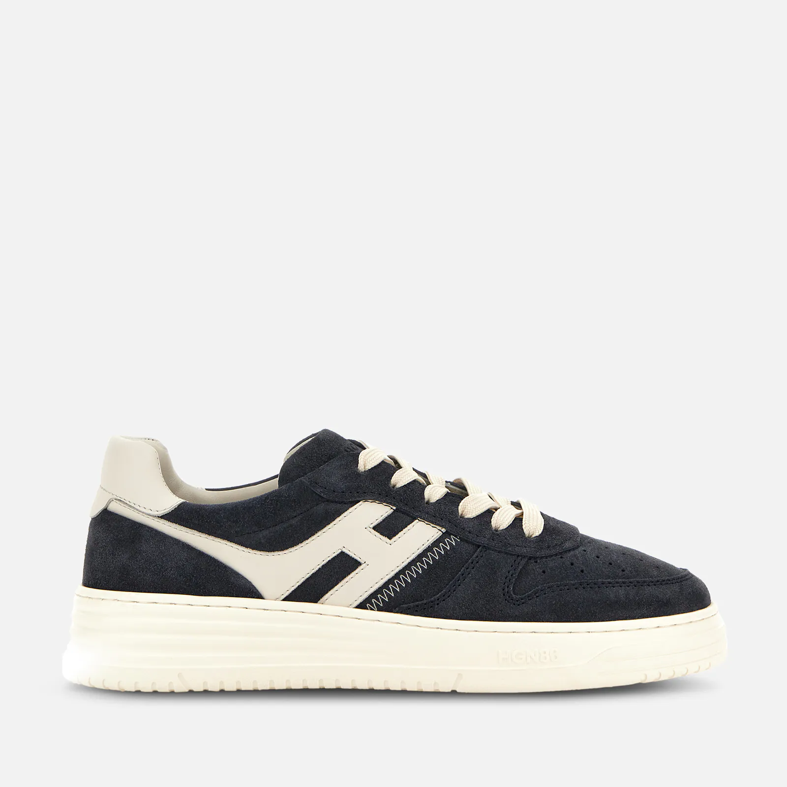 Les sneakers Hogan H630 allient des lignes inspirées de l'univers du basket aux caractéristiques typiques de la marque. Le dessus en cuir velours se distingue par un H allongé en cuir lisse qui tourne autour du talon. La semelle est en EVA extralight, avec le nouveau logo HGN86 en relief sur le côté et des lignes nuancées rappelant les rainures historiques Rebel. Véritable must-have du vestiaire contemporain, ce modèle dynamique est complété par une semelle en mousse à mémoire de forme qui assure souplesse et amorti.