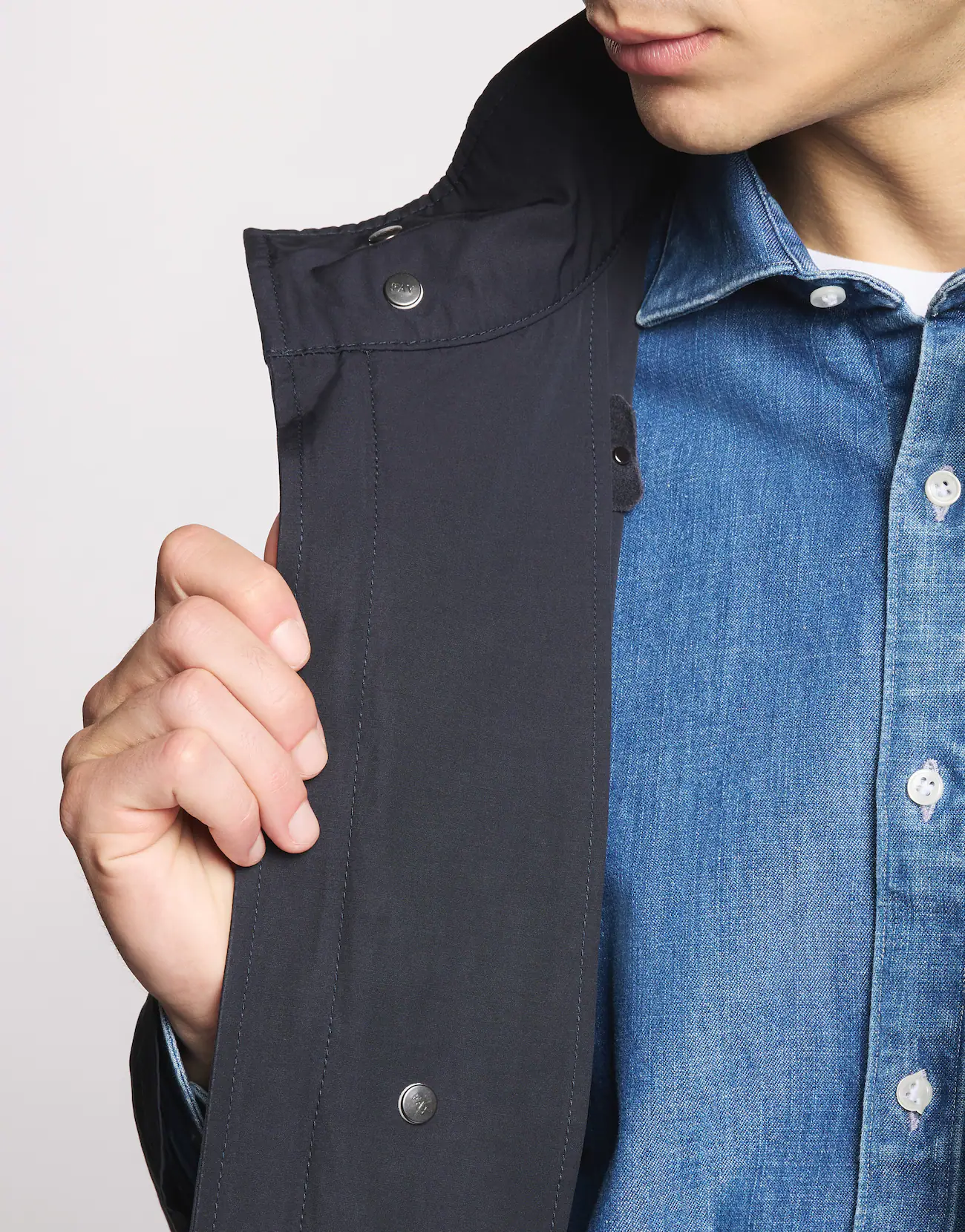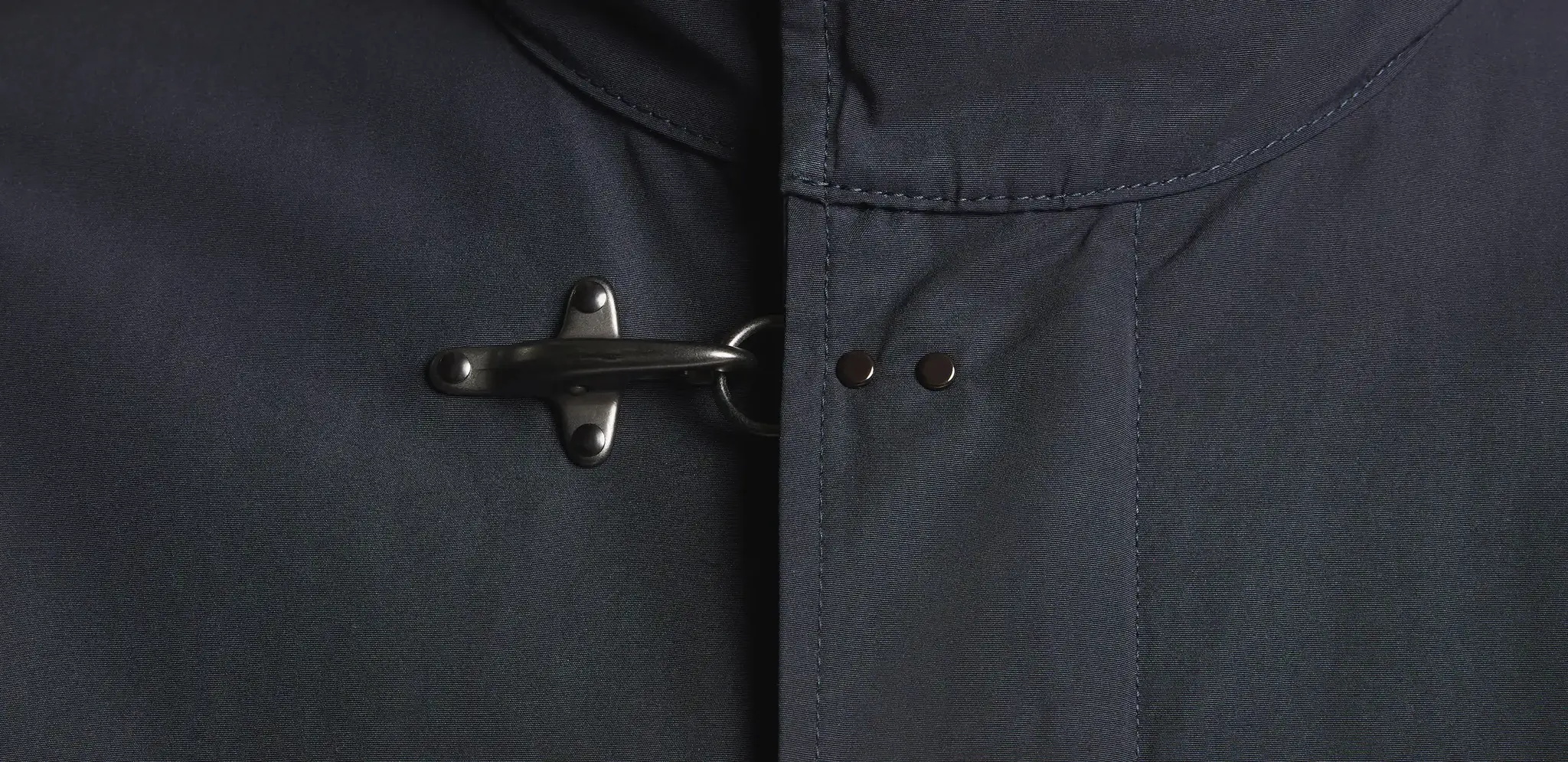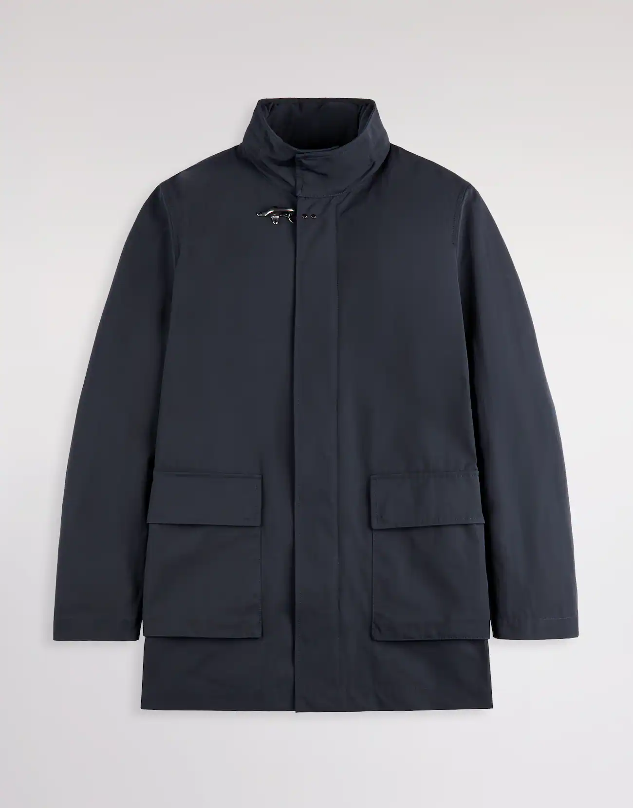 Manteau non doublé en microfibre mélangée à du coton, doté d'un col montant et d'une capuche amovible. Fermeture zippée, boutons-pression dissimulés, crochet emblématique au col et poches plaquées à double rabat. Une poche intérieure complète le vêtement.